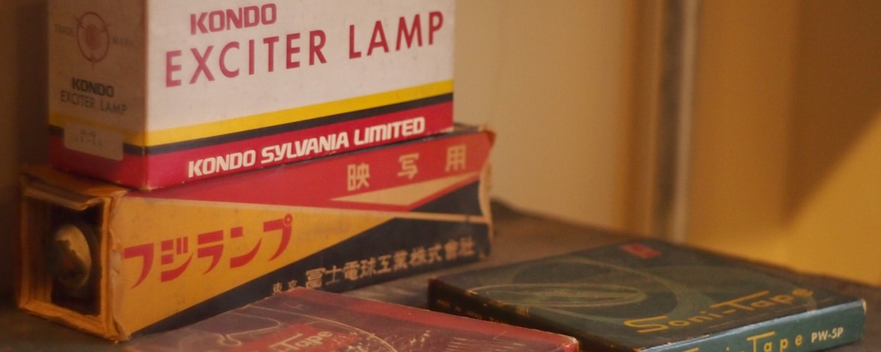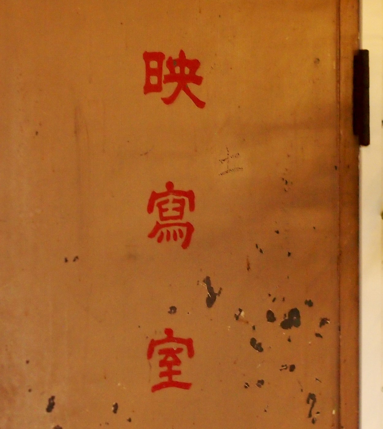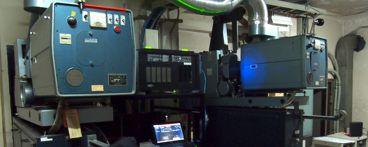 現在映画の上映は中央の小さなパソコンで行っているが、以前使用していたフィルム映写機もそのままの形で残してある。