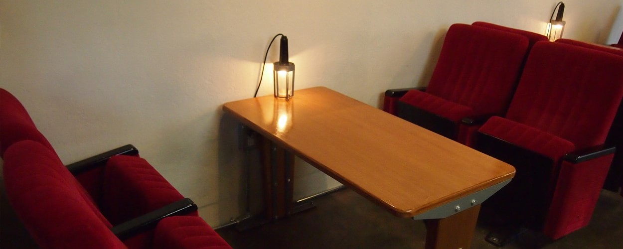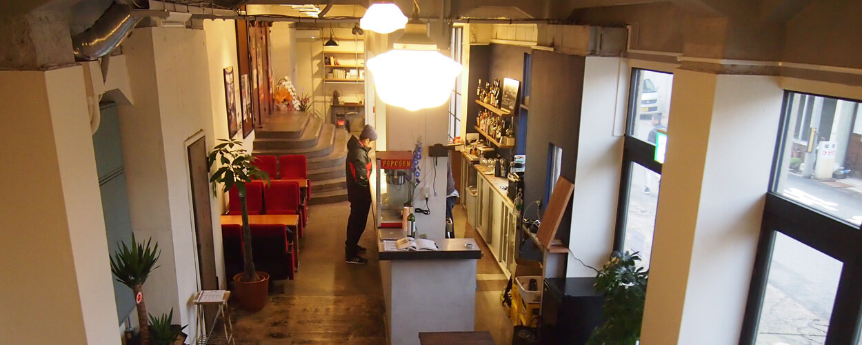 豊劇のロビーは、イベントができるちょっとしたコミュニティスペースとなっており、受付もかねたバーカウンターでは、飲食の提供も行う。その向かいに用意された2つのソファ席、実はよく見ると映画館の椅子である。