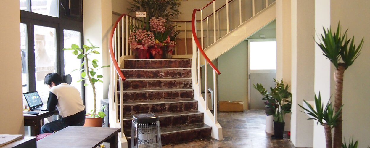 小ホールに続く階段からの光景。以前は中央に壁があったが、これをぶち抜いてオープンな空間づくりをした。