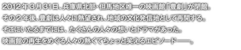 2012年3月31日、兵庫県北部唯一の映画館「豊岡劇場」、通称「豊劇」が閉鎖。その2年後、豊劇は当時の面影を残したまま、新たな価値を生み出す場所として生まれ変わる。