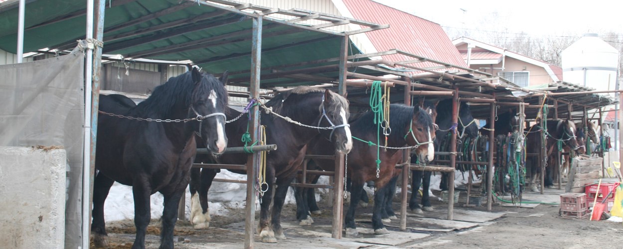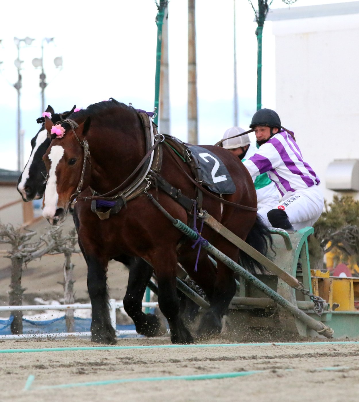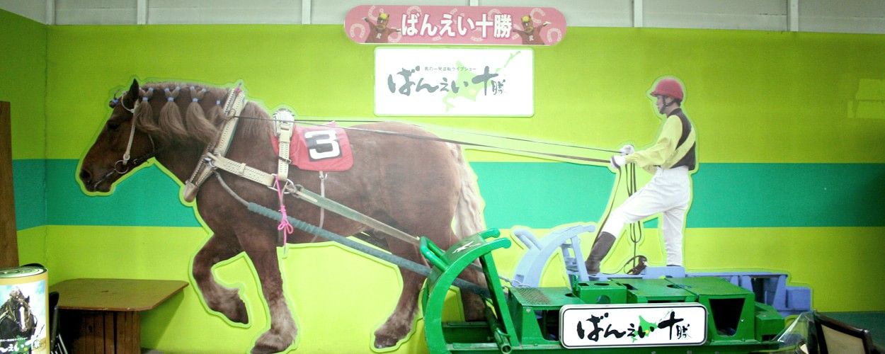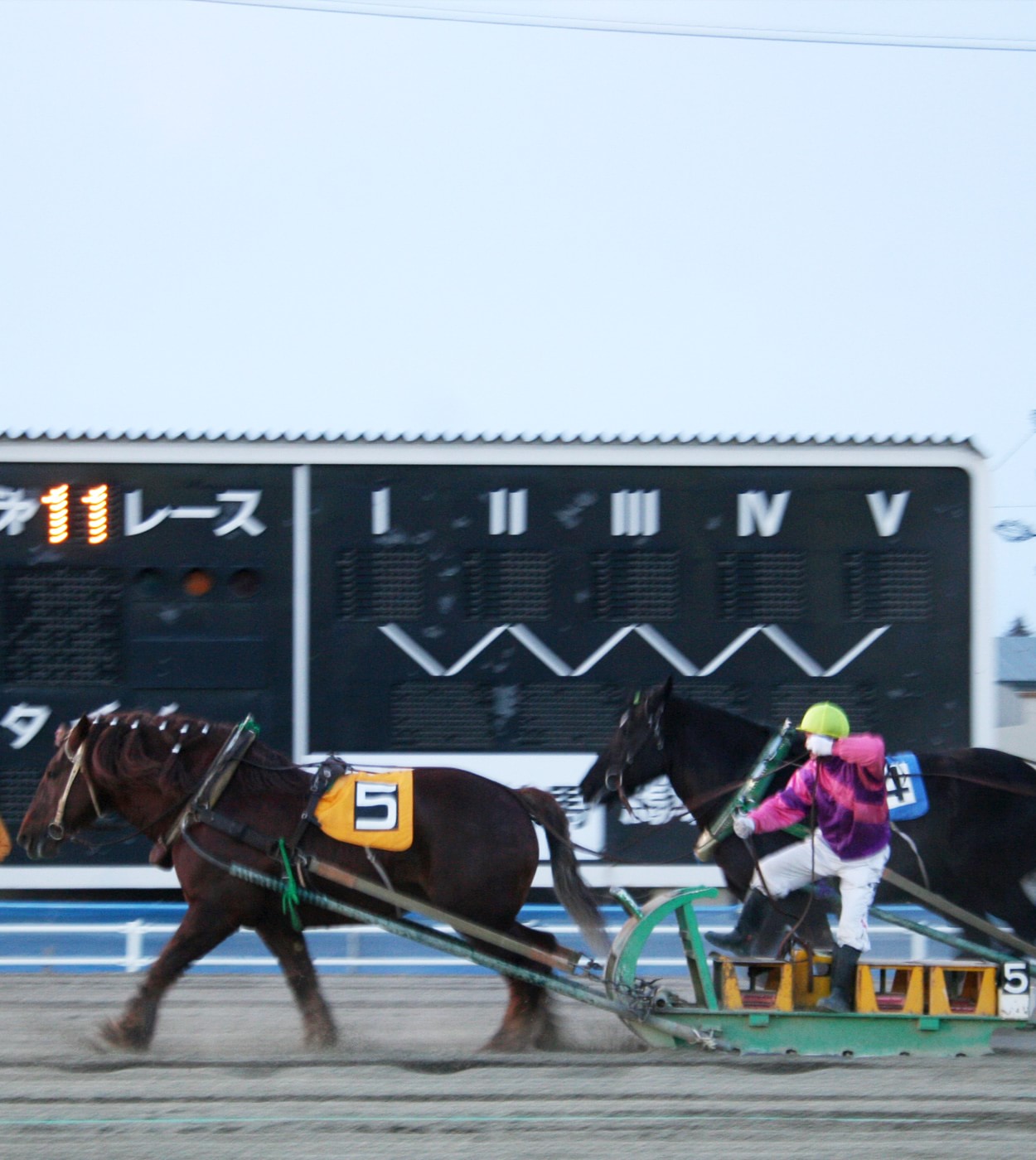 【「ばんえい競馬」は鉄ソリを馬に曳かせ、全長200m、途中に2か所、障害(坂)のある直線コースで競うレースです。 よく知られている平地競馬とは違い、スピードだけではなく、馬の重いものを引っぱる力と持久力そして騎手のテクニックの勝負です。 このレースは北海道開拓に活躍した農耕馬で農民たちがお祭り競馬として楽しんでいたものがシステム化され現在の形に発展したもので(中略)、北海道が育てた世界でたったひとつの「ひき馬」競馬として内外の注目を集めています】