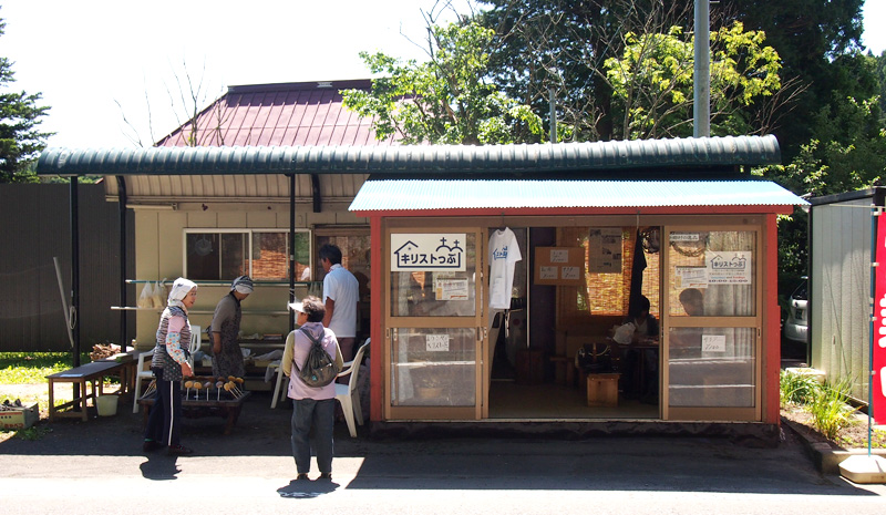 店の中には、教会と六芒星をかたどったクッキーや、キリストの遺言書手ぬぐい、キリストっぷTシャツなど、多彩なオリジナルグッズが並ぶ。キリストグッズに紛れて新郷村産のしいたけも陳列されている。どうやら土産物店らしい。店の隣のスペースでは、「キリストもち」という名のキリストとは関係なさそうな味噌つけ餅が販売されていた。観光資源フル活用である。