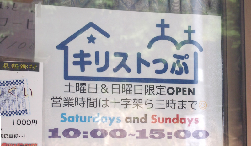 乗り込んでからおよそ5分でバスは会場に到着した。駐車場のすぐ脇に小さなプレハブ小屋がある。『キリストっぷ』……明らかに某コンビニエンスストアを意識したデザインの看板だ。営業時間を見ると「十字架ら三時まで」と書いてある。なかなかのギャグセンスだ。