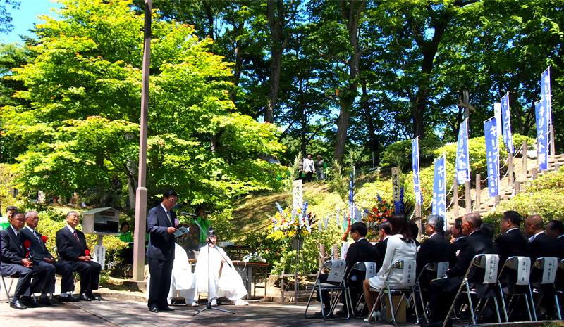 祝詞のあとは引き続き、神事である玉串奉奠(たまぐしほうてん)が行われた。もの静かな囃子をBGMに、招待客が順々に玉串を祭壇に供えていく。それから獅子舞があり、続いてキリストの墓にまつわる短歌の表彰式が終わると、会場の視線が一気にこちらに集まった。