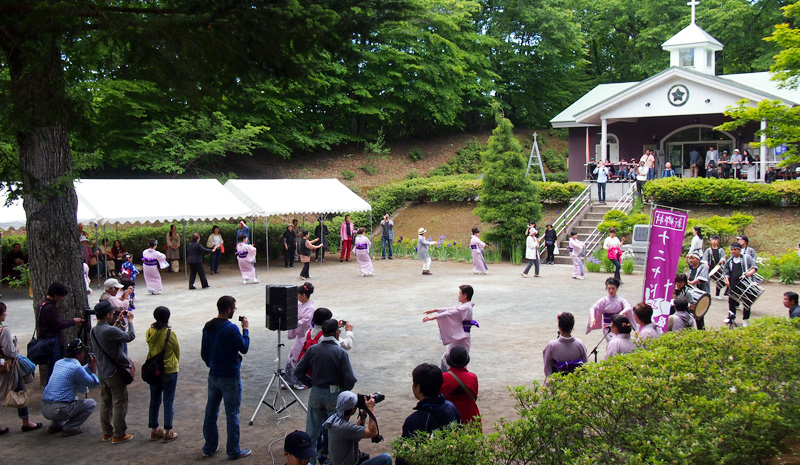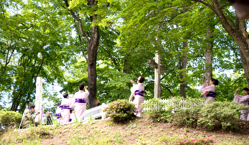 会場内にある「キリストの里伝承館」にでも寄って帰るか……と、とぼとぼ歩き出すと、「これからナニャドヤラ踊りますよ〜!みなさんもぜひ参加してください〜!」という声が聞こえてくる。見ると、先ほどの紫の着物のご婦人方が広場に集まって輪を作っている。どうやら、一般参加者も参加可能な踊りの場が提供されるらしい。帰宅の歩を一転、私は広場へと走った。
