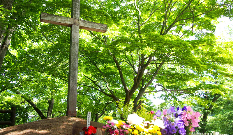 会場を見渡すと、左手奥に黒い墓石が目にとまった。墓標には「沢口家」とある。右手を向くと、小高い丘の上に、写真で目にしたあの十字架が見えた。「あれがキリストの墓か……」神妙な面持ちで会場を奥へと進み、丘を登る。