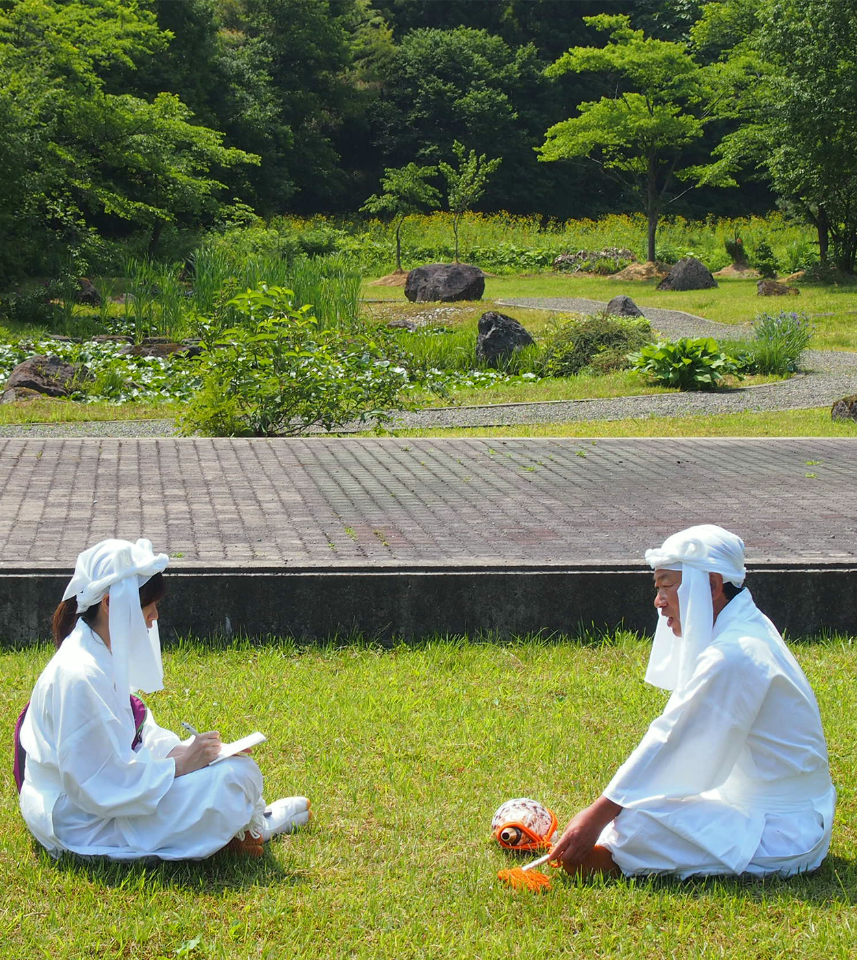 先達にうながされ、芝生の上に座る。2人だけの峰入式が始まった。
