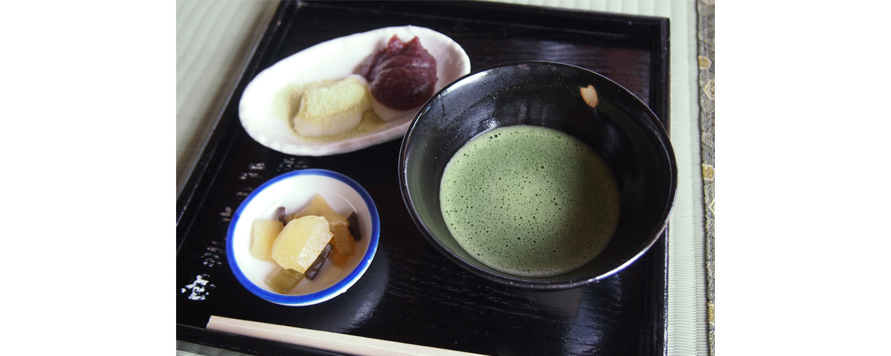 庄内平野をイメージした緑色のきなこと、あんこがかかった力餅を、抹茶とともにいただく