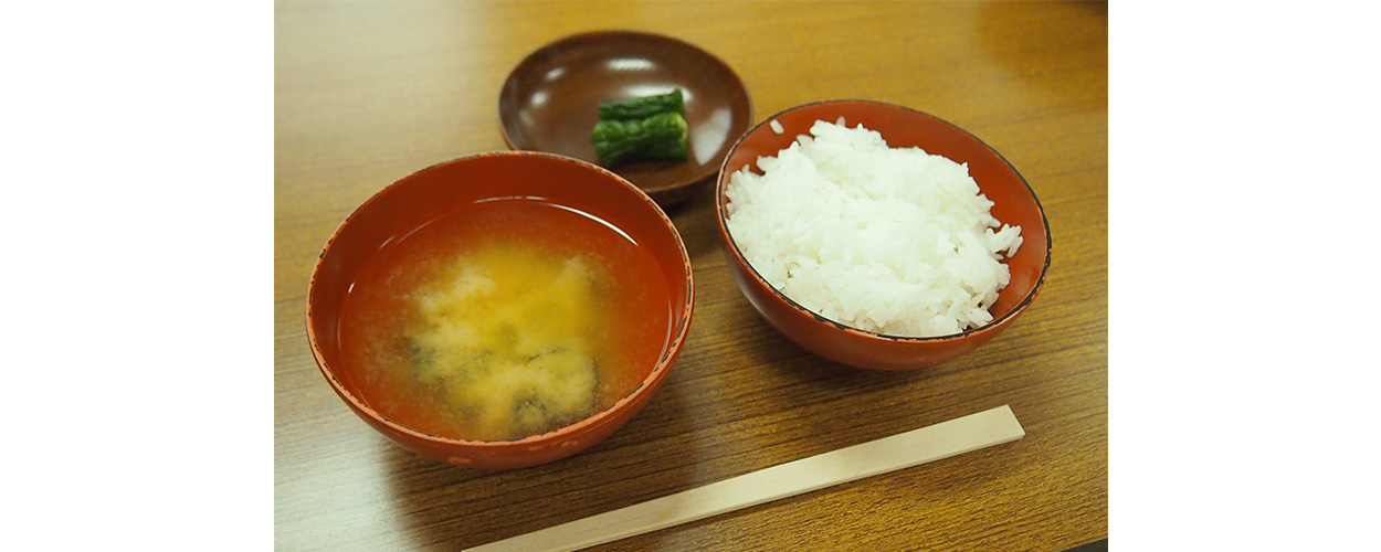 記念館に戻った私たちを待っていたのは、待ちに待った昼食「壇張り(だんばり)」だった。盛りきりのご飯にたくあん2切れ、味噌汁というシンプルなメニューだ。あえて質素にすることで、普段食べているもののありがたみを知る意味があるという。