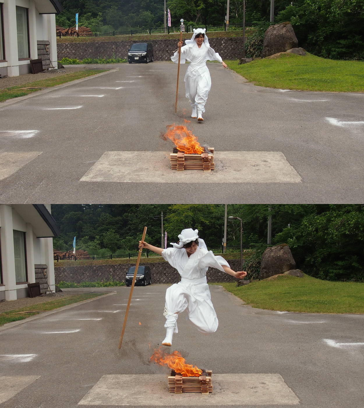 この火は、赤ちゃんが生まれて一番はじめに体験する「産湯」にちなんでいて、不浄を清めるという意味があるそうだ。キャンプファイヤーに火をつけると、あっという間に炎は膝上の高さまで燃え上がった。これはこれでかなり怖かった(写真の表情を見てわかる通り)が、決死の思いでまたいでみると案外熱さは感じなかった。