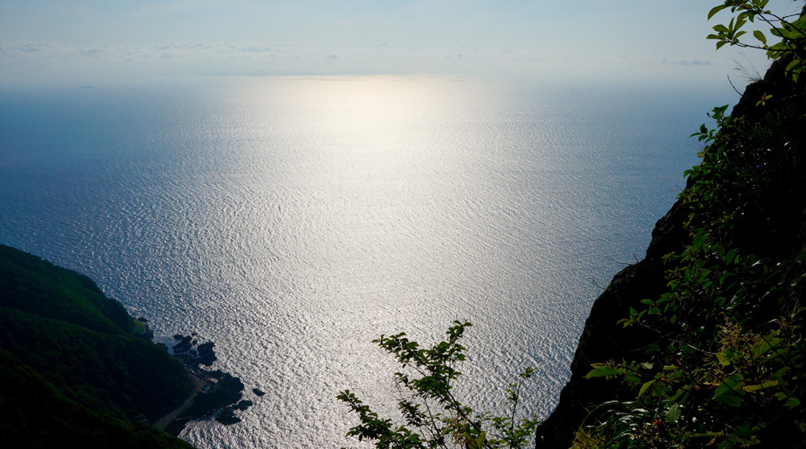 下を見るくらいなら目を瞑ったほうがマシだ。ガシャガシャと鎖を揺らしながら、一手ずつ、一歩ずつ。緊張と筋肉痛が頂点に達したそのとき、崖の頂点に手が届く。最後の力を振り絞って足を上げて半身になり、一気に崖の上に転がりこむ。あご先の汗をぬぐって顔を上げると、目の前に本殿があった。そして後ろを振り返ると、そこには伝えようのない絶景が広がっていた。過剰なアドレナリン分泌に加えて達成感も安心感も。クライマーズハイで目にした光景は写真には写せない。