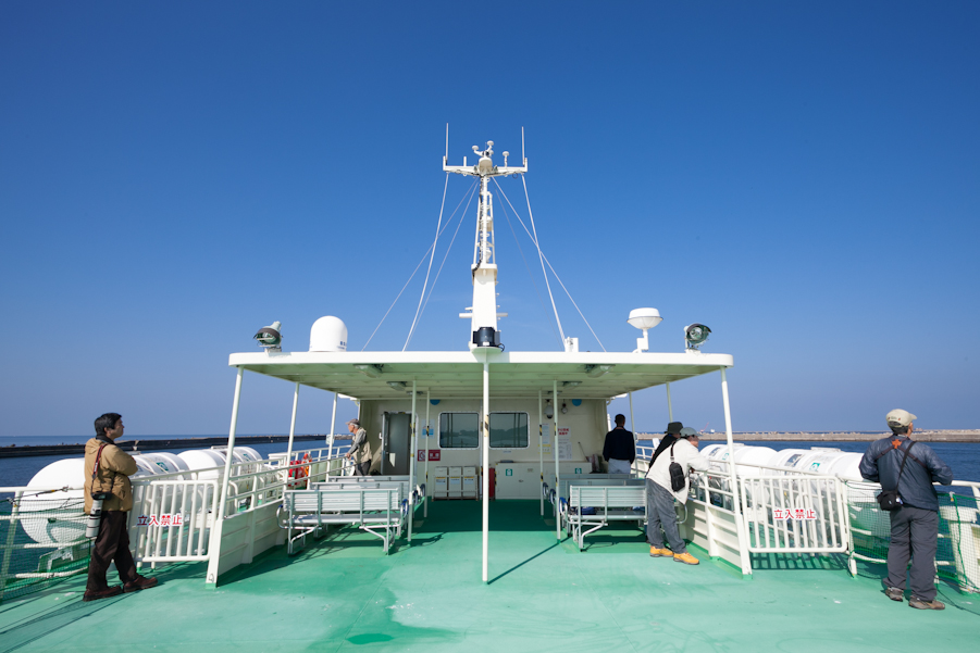 いよいよ9時半に出航、飛島まで約一時間半の航路である。港はぐんぐん遠ざかり、代わりに右手には青空の中にくっきりと美しい山が見えてくる。きっと鳥海山だろう。視界は良好、やや北西の風が吹いているが、概ね穏やかな秋晴れの日本海である。