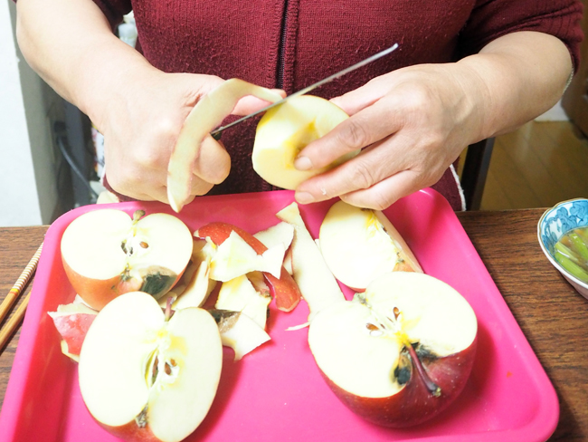 2種類の鍋の後は、律行さんが育てたリンゴと洋ナシの食べ比べ。既にお腹がパンパンだったはずなのに、甘くてジューシーで結局、もりもり食べてしまった。ビックリしたのは、木村家ではリンゴの皮の色や形状を見て「これは○○」と品種がわかること。さらに、「これは蜜がたくさん入っていて甘い」「これはイマイチ」とリンゴや梨の味の違いにとにかく敏感。さすが生産者とその家族!