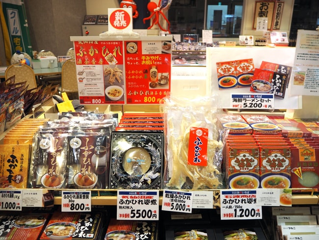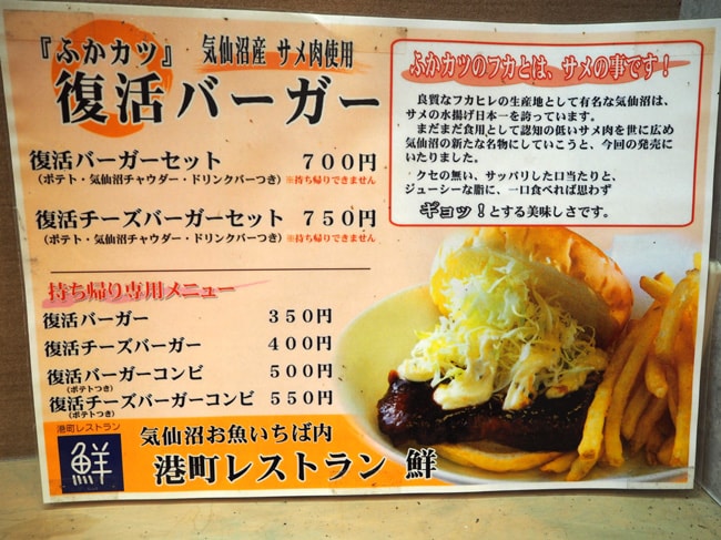 店内をぐるっと巡ると、サメの水揚げ日本一を誇る気仙沼だけあって、とにかくフカヒレ推し! フカヒレ茶、姿煮、乾物、かまぼこ、活揚げ、パイ菓子などなど、これでもか! というほどフカヒレ関連商品がある。なんと、併設の食堂には、サメの肉を使ったハンバーガーまであった。フカヒレ=高級食材という印象しかなかったけど、こんなに何にでも活用できるとは!