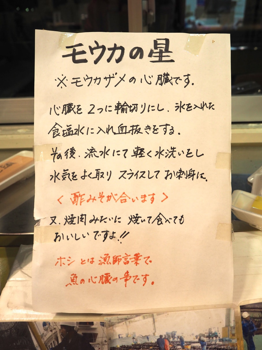 そして、ありました! モウカの星、の解説が。でも、肝心のモウカの星が置いていない。店員さんに聞いてみると「3連休の最終日で、船が出てないからね(その日は11月23日だった)。明日、水揚げされれば届くと思うけど……」とのことだった。
