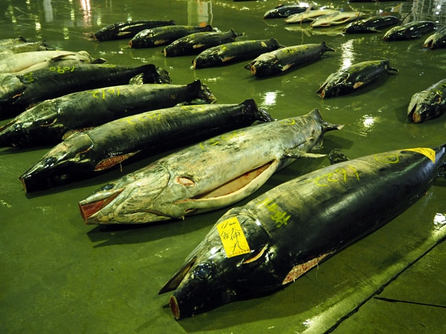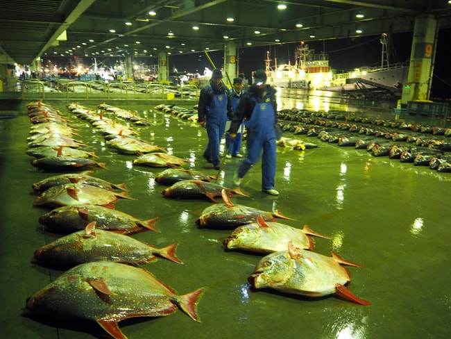 コンクリートの上にはテレビでしか見たこともないぐらい巨大な魚がデーンッと横たわっていて、「おお! デカい!」と騒いでいると、熊谷さんが「これはカジキです。今日、一番大きいのは200キロぐらいありますよ」と教えてくれた。カジキといえば尖った鼻先が特徴だけど、切り落とされていて気づかなかった。最大300キロにもなるそうで、大きさの想像がつかない。