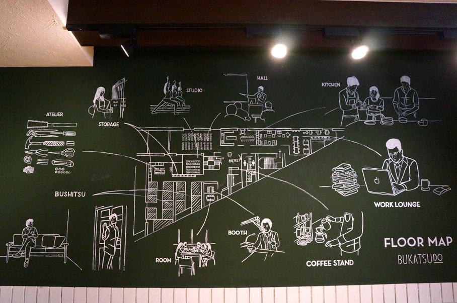 フロアマップを見てみると、ひときわ異彩を放つ「BUSHITSU」のほかに、ワークラウンジ(シェアオフィス)やイベントスペース、コーヒースタンド、ヨガスタジオ、DJブース、キッチンまで揃っている。この場所ひとつで何でもできそうだ。と、そこに。