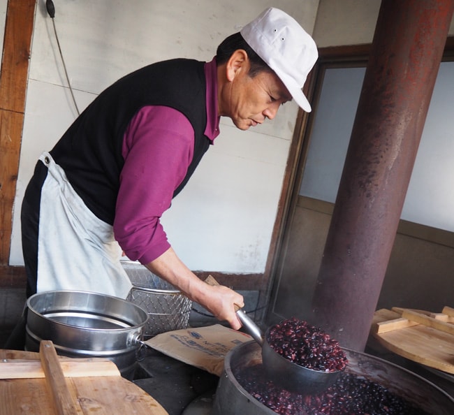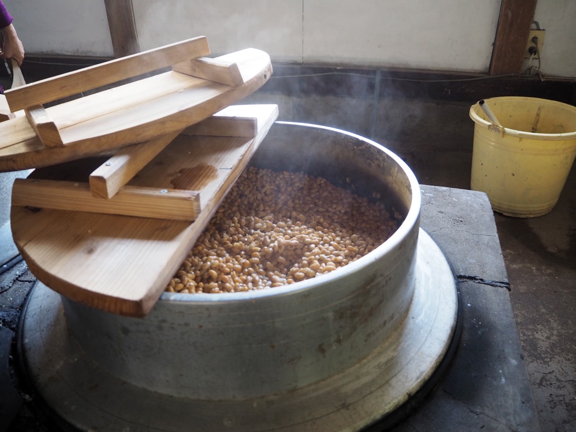 「どうぞ、こちらは釜屋ですよ」と案内された部屋では、巨大な釜で豆が煮えていた。蓋をあげるとふわあっと湯気が上がり、すばらしい豆の香りが立ち込める。釜の下では、薪の火が勢いよく燃えていた。薪の釜は今や全国的にも珍しい。手間暇はかかるが、ふっくらと大豆や米を炊き上げてくれるそうだ。それらが味噌や糀の材料となる。