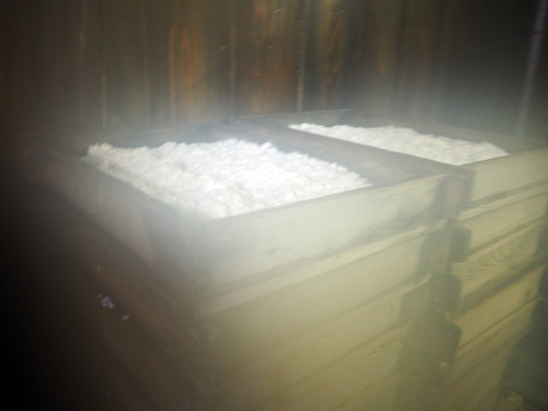 次は天井が低く、蒸し暑い部屋に案内された。この部屋で蒸米に糀菌を入れて寝かせ、ゆっくりと四日をかけて発酵させる。もわっと湯気が立ちこめ、サウナみたい。たしかに、こりゃあ、菌がよく育ちそうだ。
