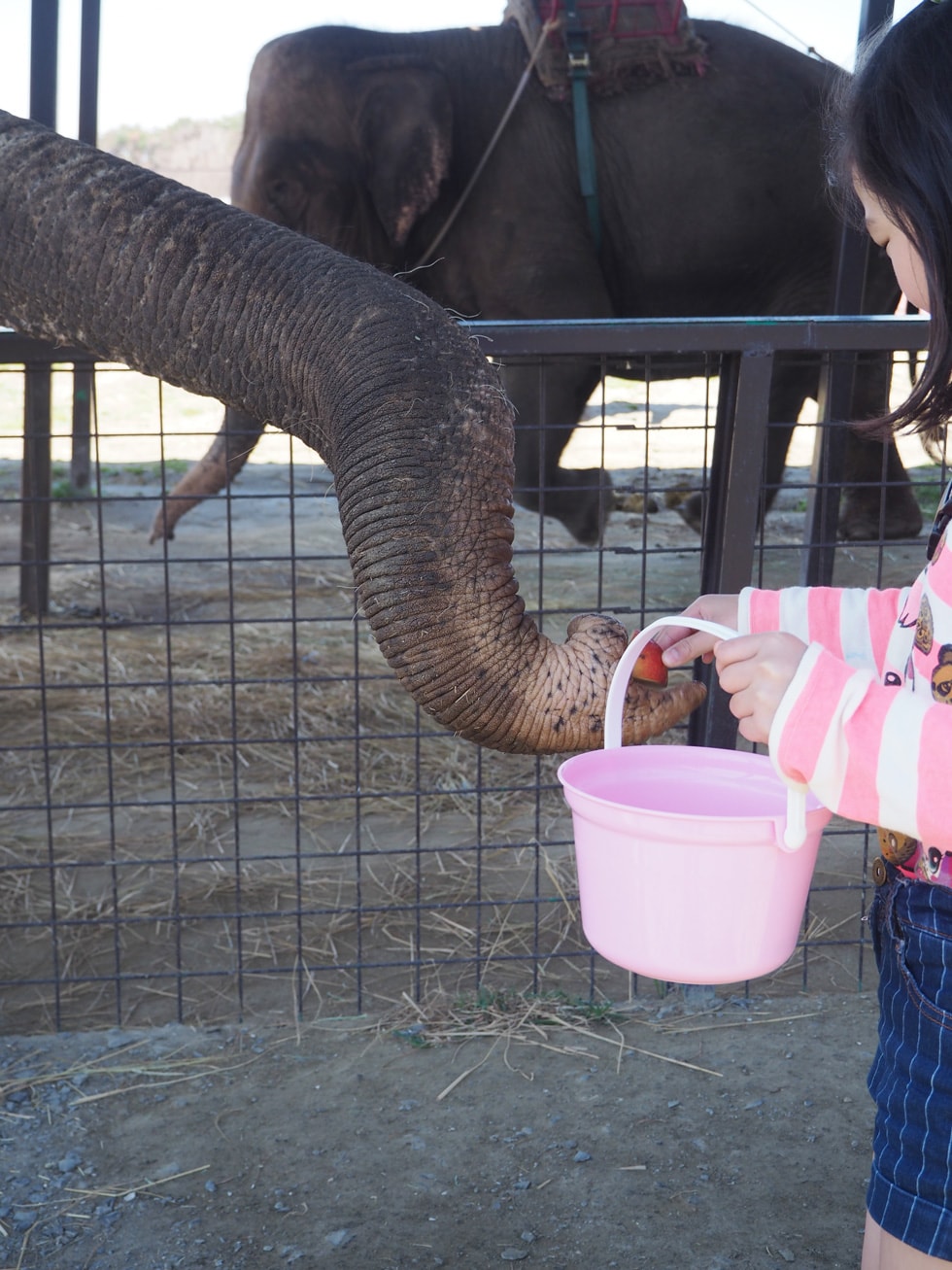 10時頃、父、母、娘の3人家族がやってきて、母と娘がゾウに乗った。ゾウは重さなど感じていないかのように悠々とコースを一周し、子どもは終始、ワー! キャー! とハイテンション。ゾウライドは、終わった後の「ゾウのえさやり」もセットになっていて、そこでも、ワー! キャー! 言いながらゾウにえさをあげていたその女の子に話を聞くと、「(ゾウの背中の上は)高くてすごく楽しかった!」と大はしゃぎで、「もう1回乗りたい!」とおねだりされたお父さんは、苦笑い。