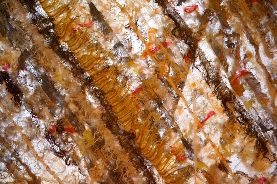 これは地元の子どもたちのワークショップ。布の切れ端を「紙すき」ですいてテキスタイルに。写真はほんの一部。ものすごい大きさです。