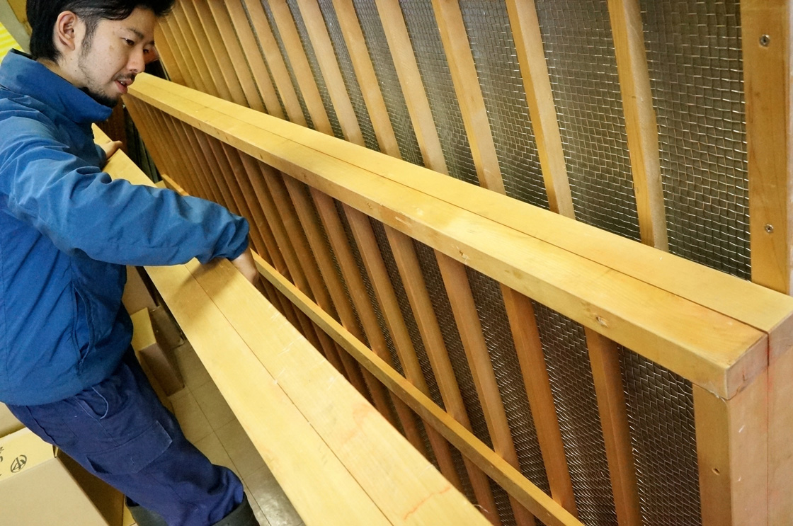 これは、タペストリーなど大きな和紙をすくときに数人がかりで使う「紙すき」です。4mはあるでしょうか。