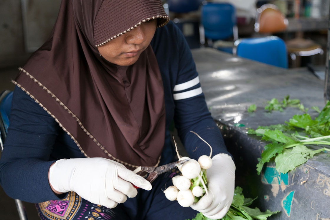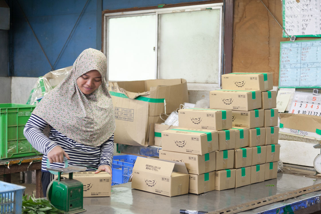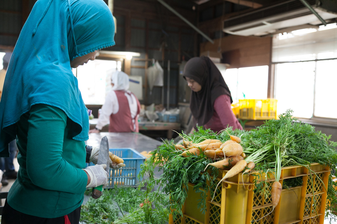さて、広い農場の一角にある作業場につれていってもらった。そこで取れたてのハーブや野菜をパッキングするのだ。ハーブと野菜を使ったピクルス作りも行っている。たくさんのスタッフの中で目につくのは、スカーフをかぶった若い外国人の女の子たち。よく見ると外国人の青年もいる。