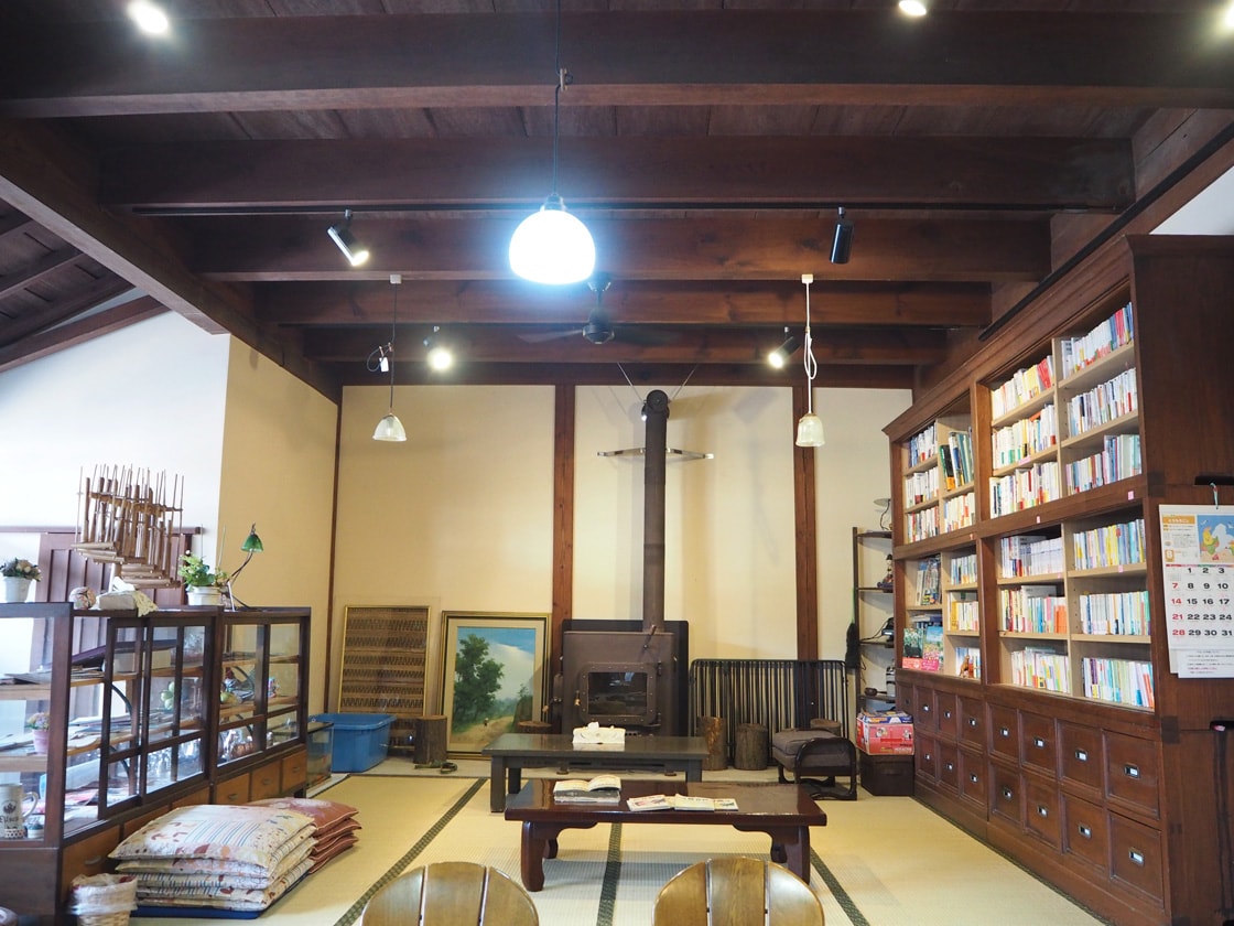 「こんにちは!」と引き戸を開けると、天井が高く広々とした空間が現れた。座敷スペースには年代物の棚があり、中には本がぎっしり!