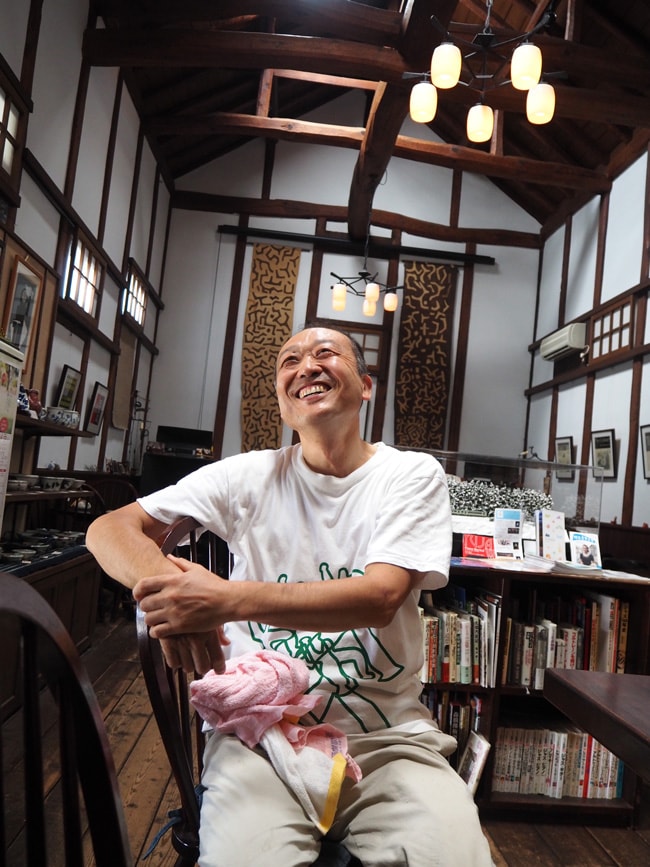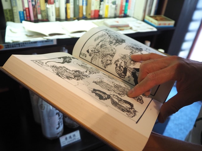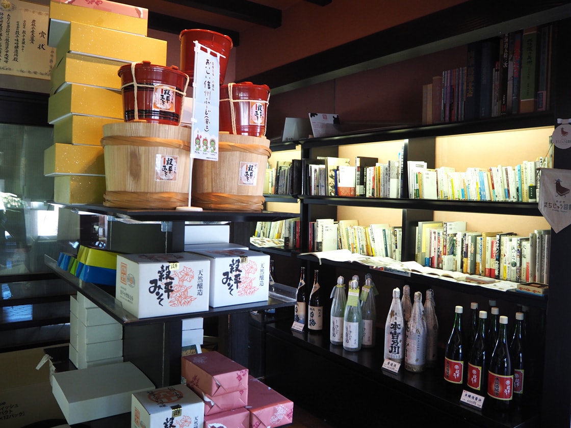 さて、三番目の図書スポットとして訪ねたのは、二百三十年以上の歴史を持つ味噌の専門店、「穀平味噌」である。迎えてくれたのは、九代目のご主人、小山洋史さんだった。お味噌やお酒、発酵食品が並ぶ店内の奥の方に、その書棚はあった。