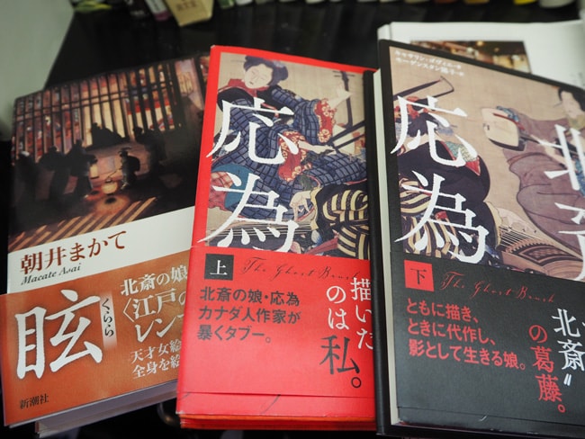書棚の中で特に目立っていたのは、葛飾北斎に関連する書籍だった。立派な全集や研究書をはじめとし、カナダの作家、キャサリン・ゴヴィエが書いたノンフィクション、『北斎と応為』や直木賞作家の朝井まかての『眩(くらら)』などが並ぶ。