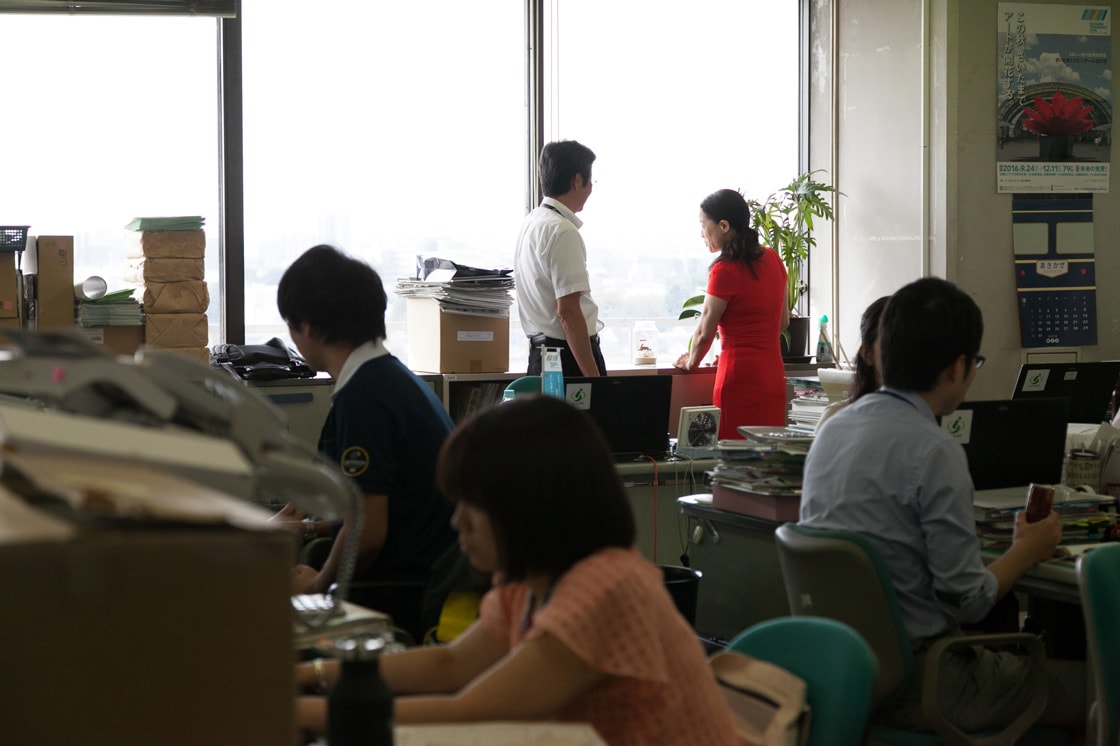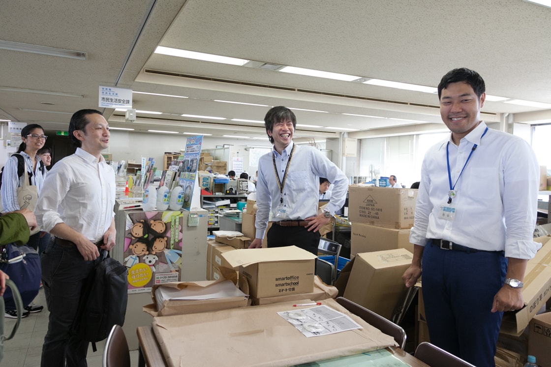働く公務員がたくさんいる、平日の静かなオフィスの中を進んでいくと、文化振興課の福司さん、野田さん、小久保さんたちが、笑顔で迎えてくれる。