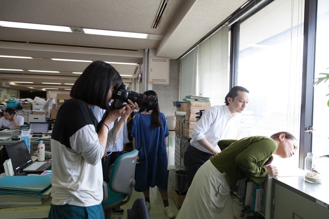 会議から戻ってきた大西課長にも登場をお願いして、いよいよ撮影。ゆっくり考えながら、撮影を進めていく川瀬さん。それを見守る「←」のチームと福司さんたち文化振興課の職員の皆さん。