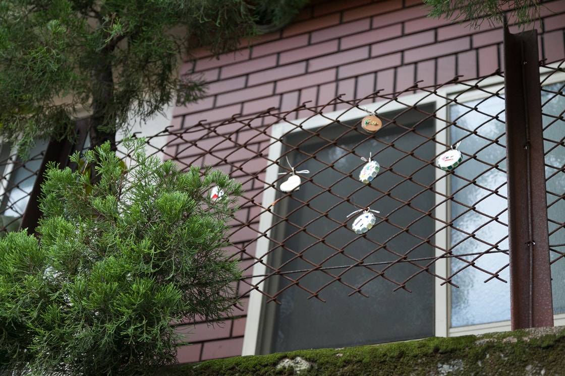 道路から見上げると、高いフェンスに小さな可愛い手作りタイルの矢印が並んでいる。