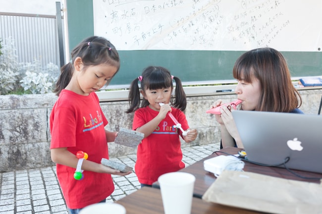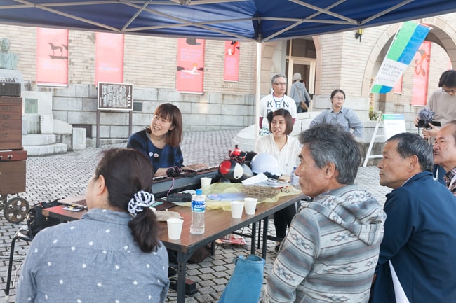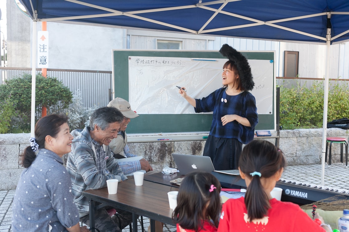 作曲家の西井夕紀子さんを招いて、参加者みんなで常陸佐竹市を表す歌詞を考え、それに合わせて西井さんと共にメロディを作るのだという。作詞はともかく、作曲はどうするんだろうか……、と思いながら、梅津会館前に設置したテントに向かった。テントの中には大きなホワイトボードと、キーボードや音がなるおもちゃなどが置かれている。