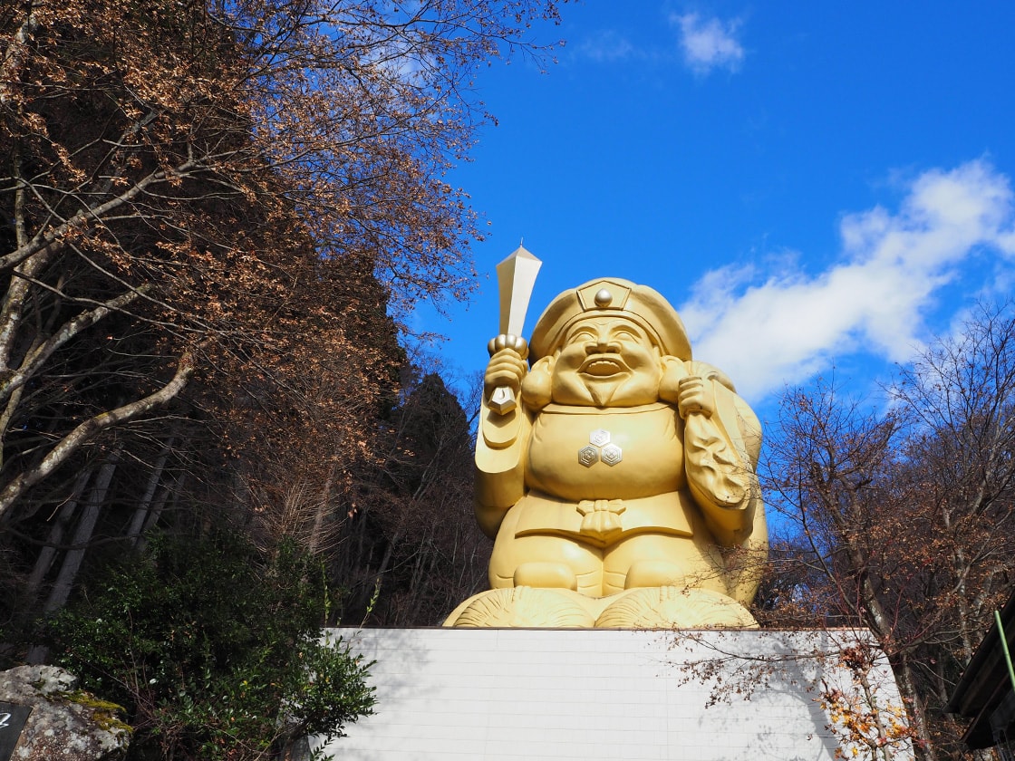 町なかから車で約25分、妙義山方面に進むと、否が応でも目に入る圧倒的存在感のだいこく様! 近づけば近づくほど、その大きさに目を奪われる。平成17年に約3,000人の氏子さんがお金を出しあい、高さ20メートルのだいこくさまが奉納されたそうだ。
