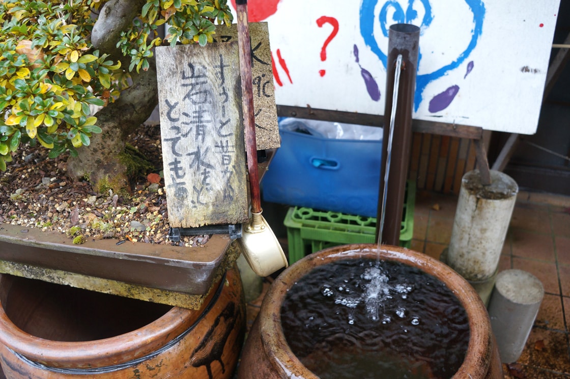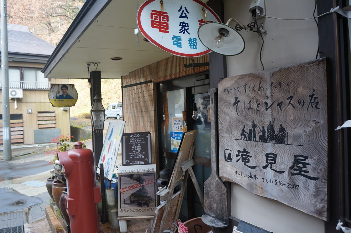 飲んでみると、これがまたやわらかくてめちゃくちゃうまい。この湧き水は、そばとジャズの店「滝見屋」の軒先にあった。あまりにも気になる店である。