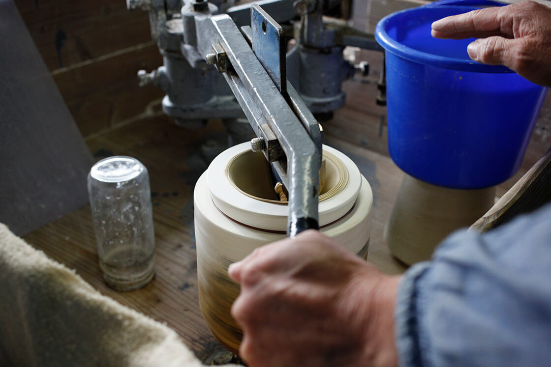 最初に藤さんの仕事を見せてもらう。まず「機械ろくろ」と呼ばれる機械をセットする。ヘラが取り付いたアームの角度などを慎重に調整し、位置を決める。それから回っている型の中に陶土を入れて、アームを下ろして型の中に薄い生地を成形していく。