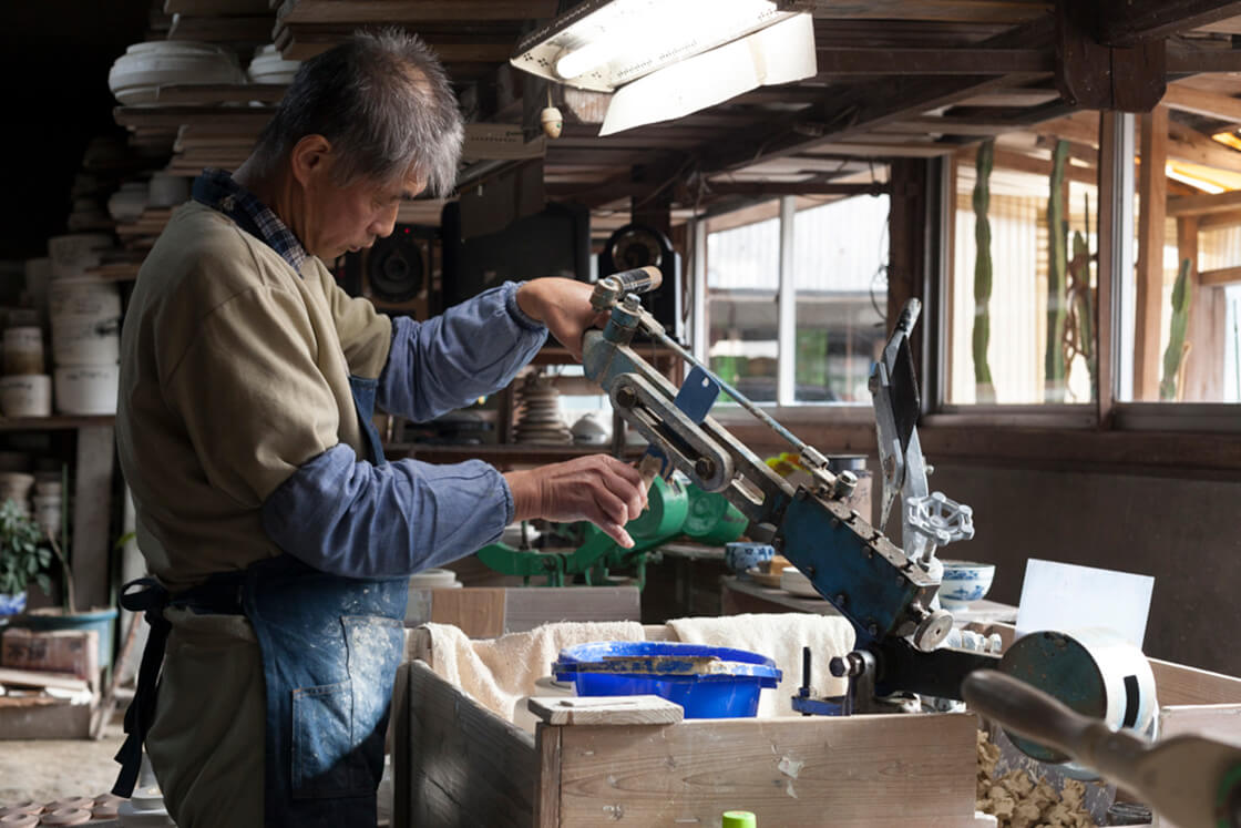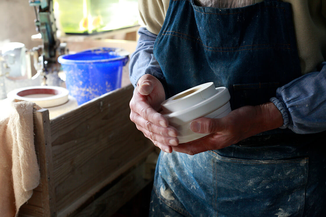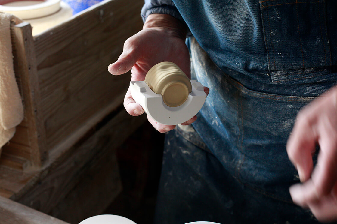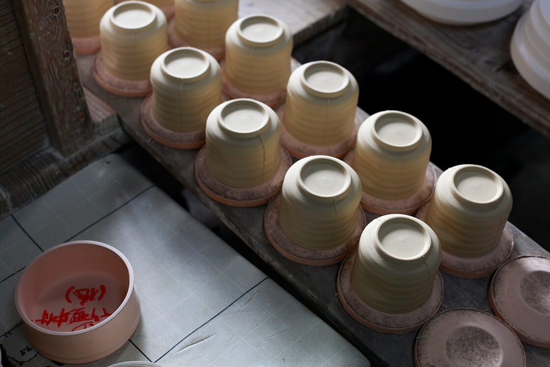 ほかにも完全に乾燥したものに削りを入れたりして、発注先(窯元や商社)の要望通りのものを一つずつ手作業で作り上げていく。藤さんはこのような作業を繰り返しながら、1日数百個も同じ生地を寸分の狂いなく、作り上げるのだ。