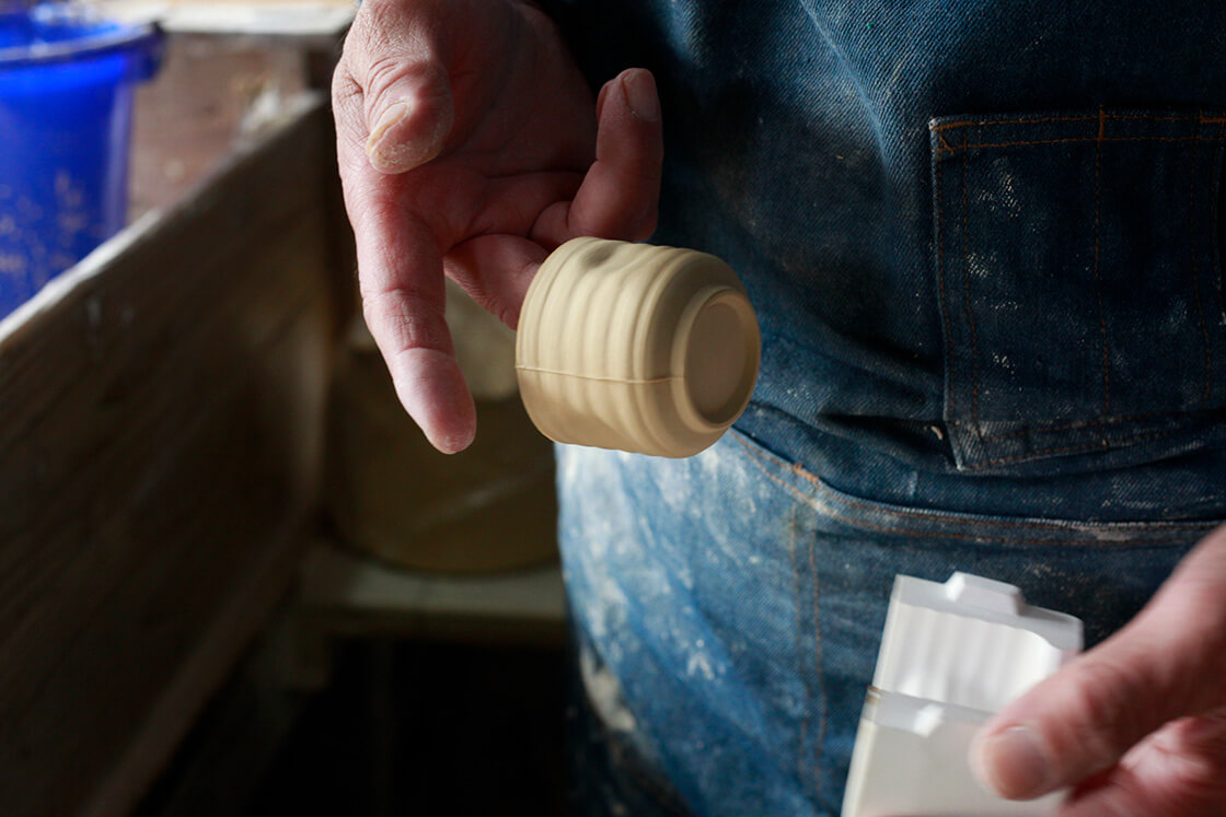 ろくろから型を外し、同じことを繰り返してうちに、だんだん、それがたまってくる。ものによって5分から30分くらいだが、しばらくそのままにしておくと石膏型に水分が吸われて中の生地が少し型から外れてくるので、そのタイミングを見計らって手で型を軽く叩いたりゆすったりしながら、さっと生地を型から外す。ちょうどよく身離れするタイミングに藤さんが型をゆすると、まだ本当は完全に固まっていないはずの薄い生地が、でもちゃんとした形を保ったまま、するんと出てくる。それは魔法のような光景だった。