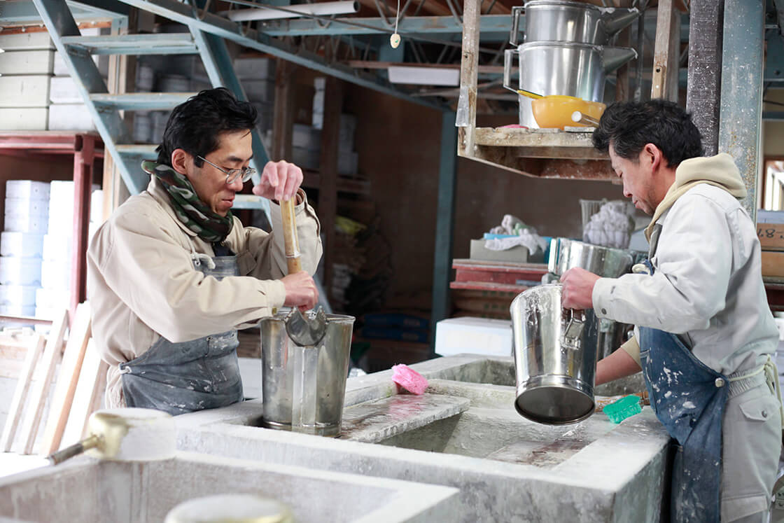 いつまでも見飽きない藤さんの仕事場を一旦お邪魔して、続いてすぐ隣の山辰さんの工場へ。工場には小さなものから重さ50キロくらいはありそうな巨大なものまで、様々な石膏型がやはり所狭しと並んでいる。もう一人の職人さんが仕事をしていて、聞くと弟さんだという。山辰製型所は家族でやっている工場なのだ。