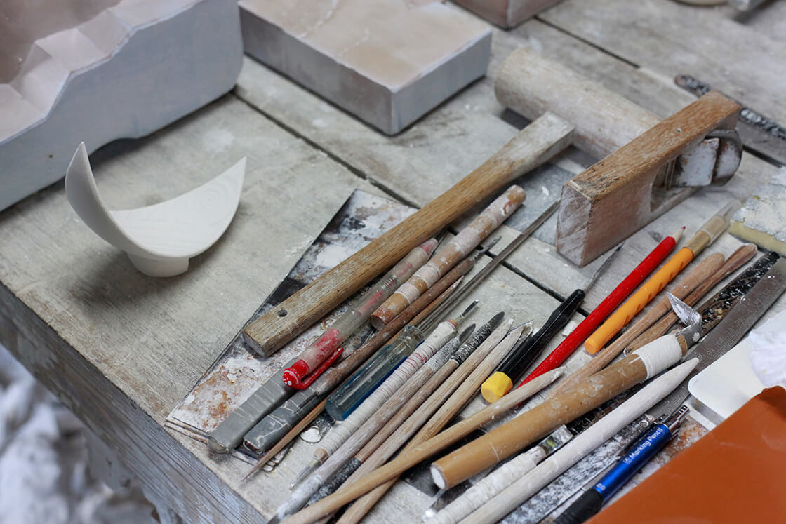 山辰さんのところには珍しい機械が沢山あって、立体の厚みを測る道具があるのだ。その他にも原型を削るための彫刻刀のような道具が沢山あるが、それはほとんど手作りなのだという。車のワイパーの中にあるよくしなる金属を使ったり、百円ショップのステンレス製の台所道具を切り出して改造したり、普段から山辰さんはいろんなものを見ては、「あ、削り出しの道具になるな、これは……」などと、いつも考えてしまうのだ、と笑う。