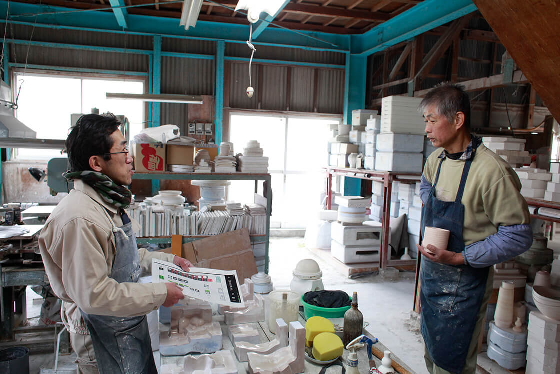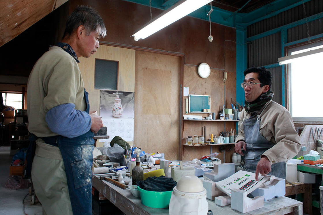 そういえば外国人のアーティストたちは、「有田はパラダイス!」て、みんな言いよらすなあ、と二人は笑って教えてくれた。他の場所だったら、石膏、陶土、それから釉薬などの薬、様々な道具など発注してから何日もかかるような材料が、有田ではすぐ手に入る。そして様々なプロフェッショナルの職人さんたちが町中に散らばっている。何かあったらこの二人のように、すぐ別の部門の職人さんたちに聞きに行くことができるネットワークもある。