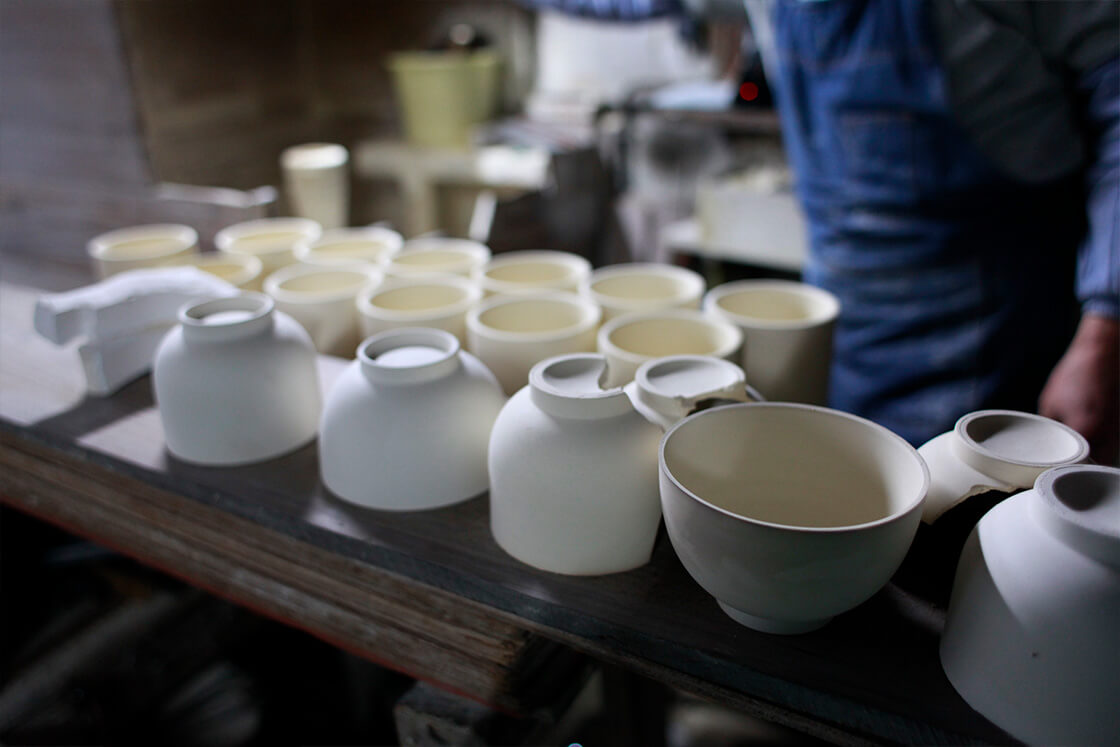 私は恥ずかしながら有田にくるまで、有田焼の名品とは、いわゆる作家ものと呼ばれるような、有名な窯元や有名な磁器作家が作る手作りのものだけだと思っていた。そしてそれ以外のもの、例えばデパートなどに同じ形で揃って売られている磁器などは、みんな機械が作っている。そう思い込んでいたのであった。でも多分、日本全国ほとんどの人がそう思っているんじゃないだろうか……?