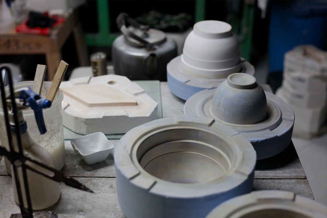 そういえば最近は香港の若いプロダクトデザイナーの器作りの仕事が面白かったね、と二人は笑いながら、設計図や生地や型の現物を見せてくれた。型は山辰さんが、生地は藤さんが担当したのだという。