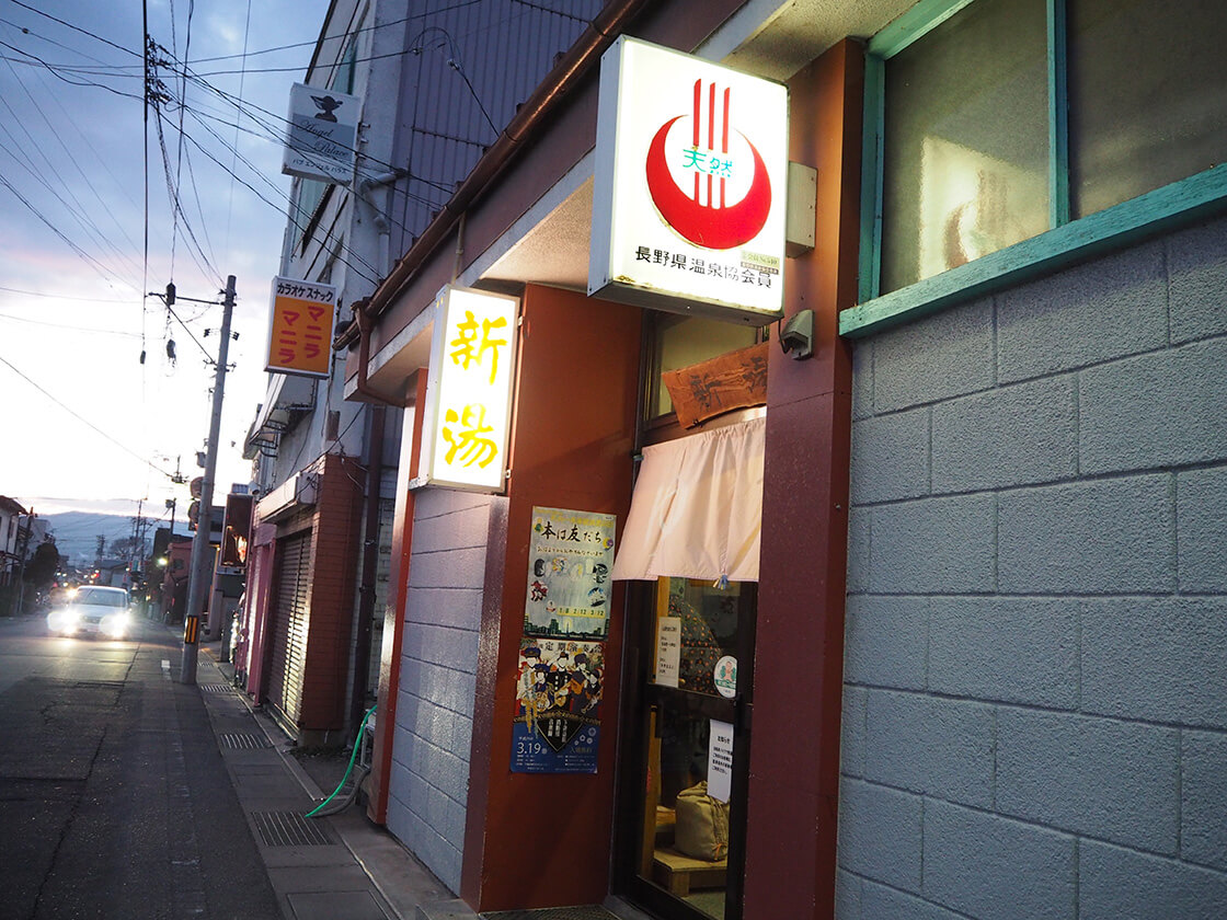 月を見ながら坂道を下ると、ぽっと明かりがついた一角があり、お風呂セットを持った男の人が建物から出てきた。看板には、「新湯」。『神田川』さながらの懐かしい風景にしばし見入った。