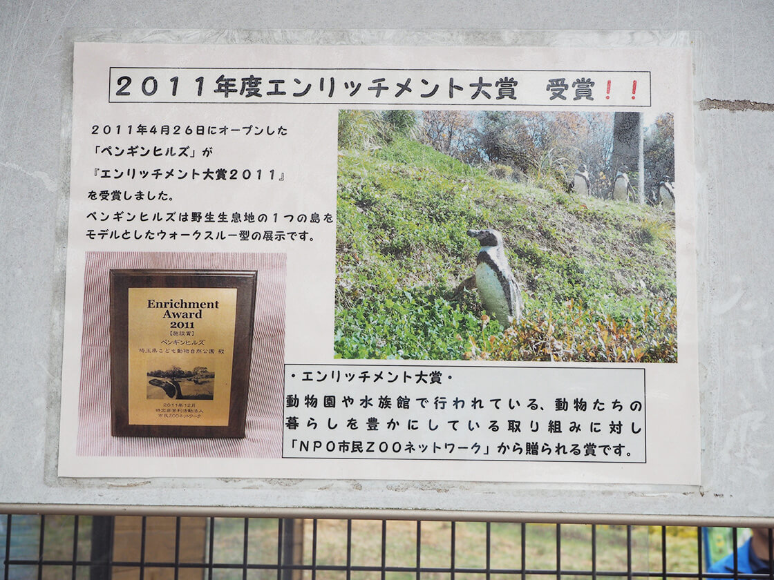 ペンギンヒルズは、動物園や水族館による動物たちの飼育環境を豊かにするための取り組みを表彰する「エンリッチメント大賞」を受賞するなど国内外で評価を高めた。ちなみに、埼玉県こども動物自然公園はペンギンヒルズも含めてこれまでに計4回、「エンリッチメント大賞」を受賞している。これは、受賞回数5回で最多の北海道旭山動物園に次いで、全国2位。あまり知られていないが、動物の飼育環境は日本でも屈指のレベルにある。