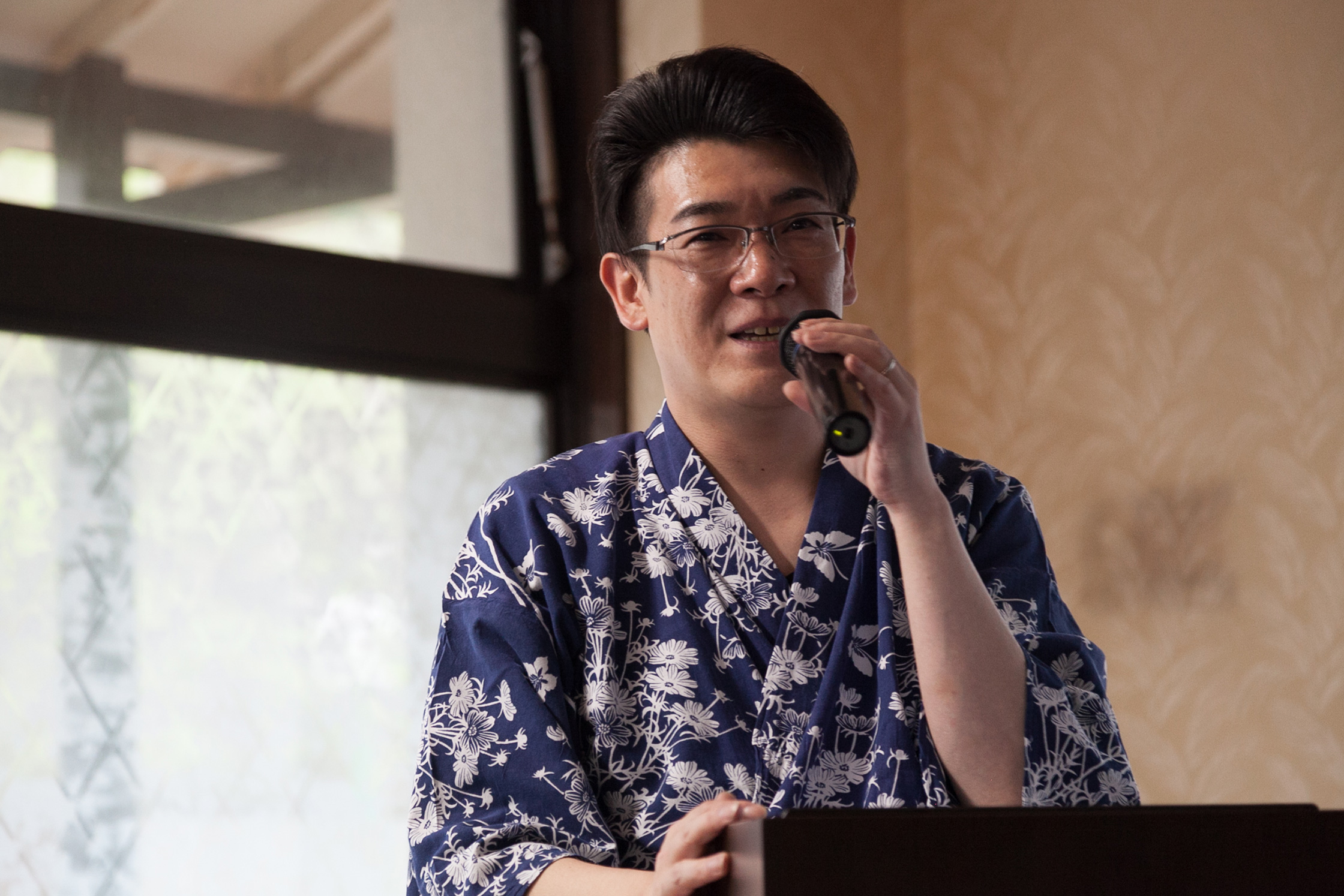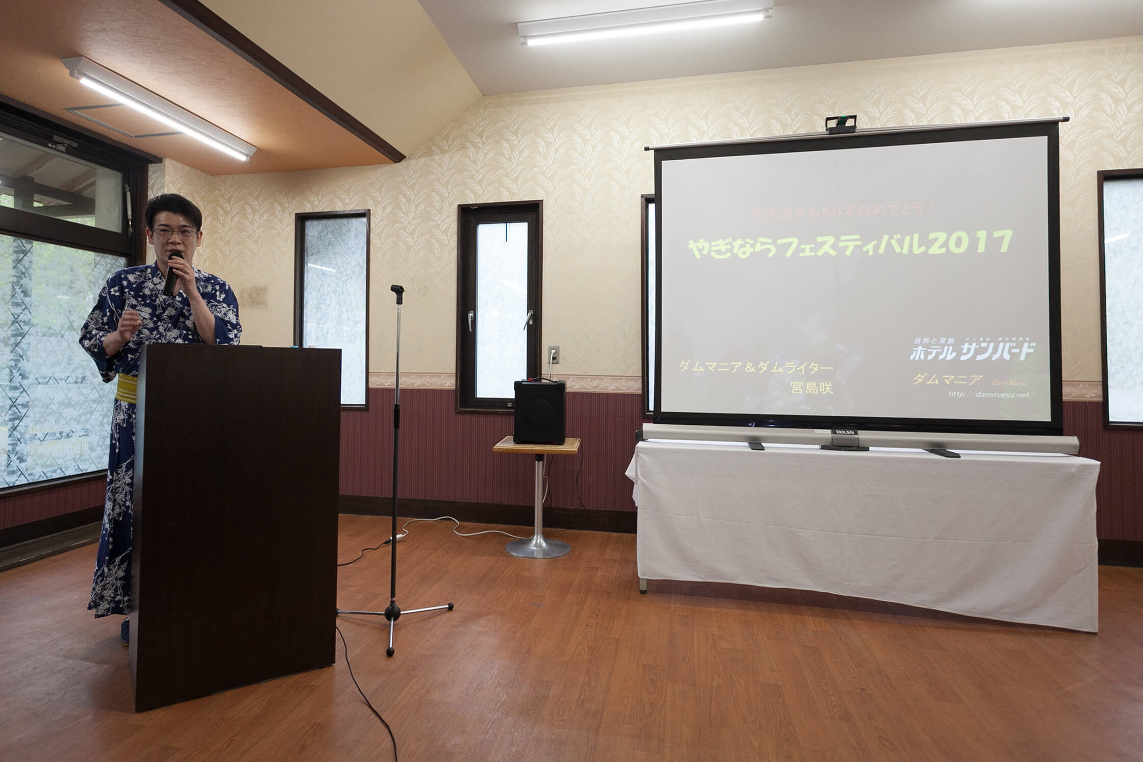 ホテルのスタッフ、高草木徳行さんの司会で宮島さんのトークが始まった。宮島さんはダムや点検放流の見どころについて、とてもわかりやすく説明してくれるのだが、それ以上にところどころにギャグが入っていて、会場は爆笑に次ぐ爆笑であった。