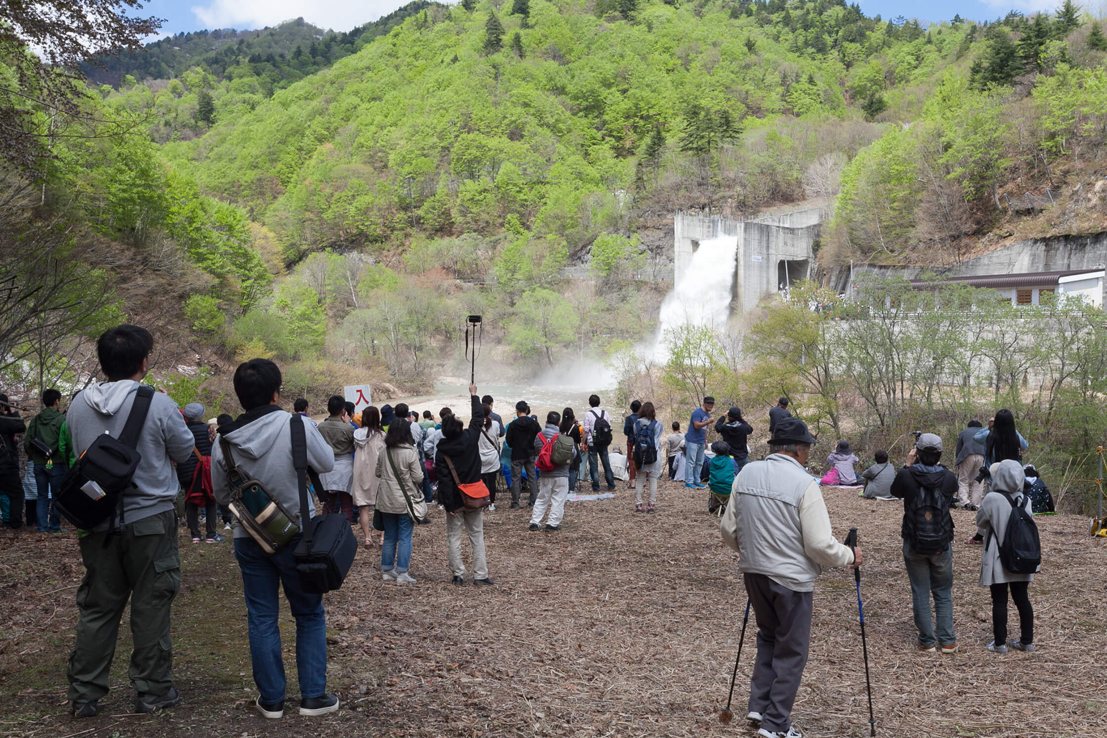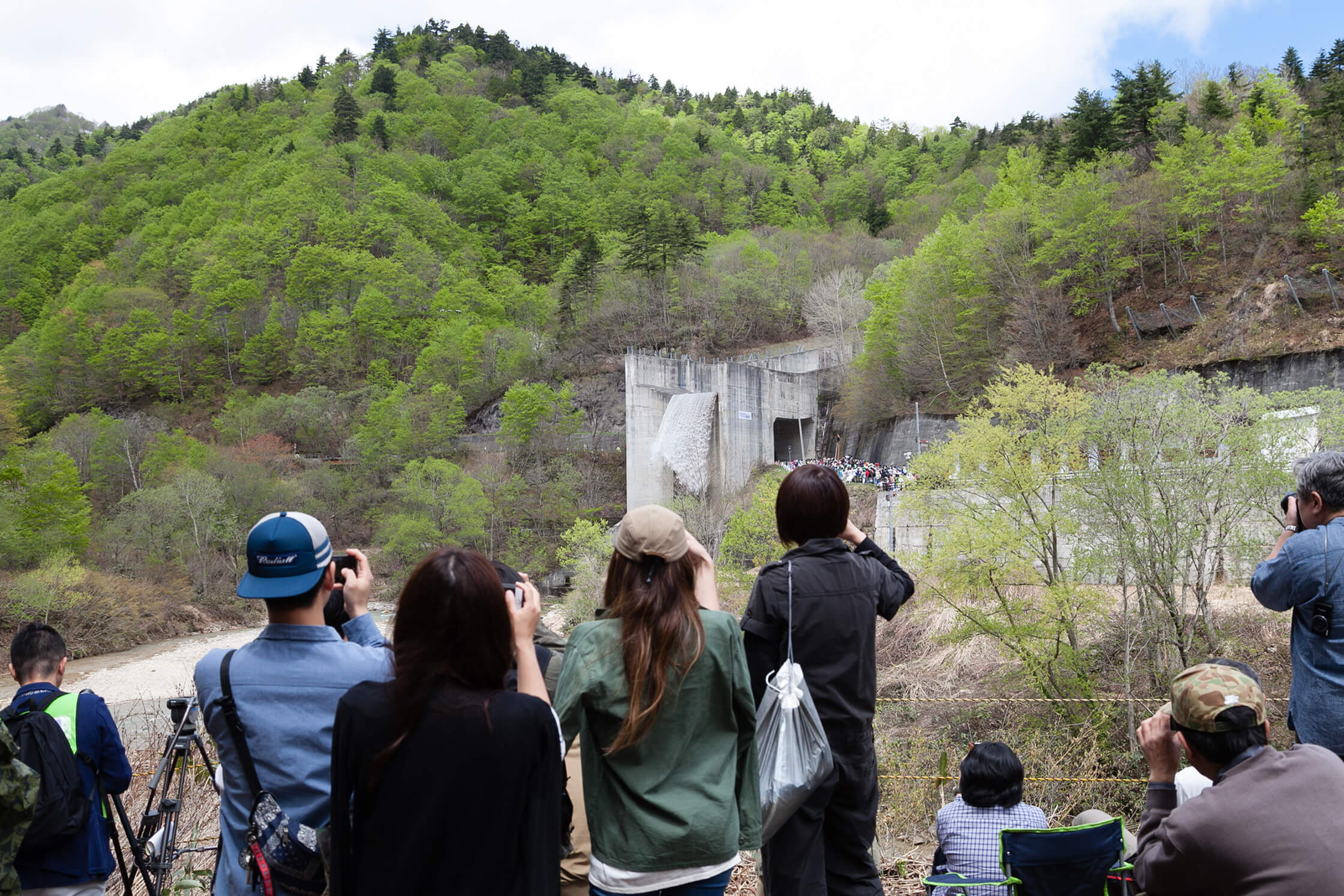 「そろそろ水量が上がりますから、ジャンプ台の真下に行ってみましょう!」という三橋さんの言葉で私たちは、前へと移動した。そこはもう人が押し合いへし合いの大混雑だ。みんなカッパを着込んでいる。ここら辺は雨のように雪解け水のしぶきが降り注ぐのだ。ダムマニアたちはそれを「ダム汁」と呼び、喜んで浴びに行くのだという。三橋さんは「この前NHKでもダム汁って言ってたから、正式な日本語になったんじゃないかな」と笑っていた。