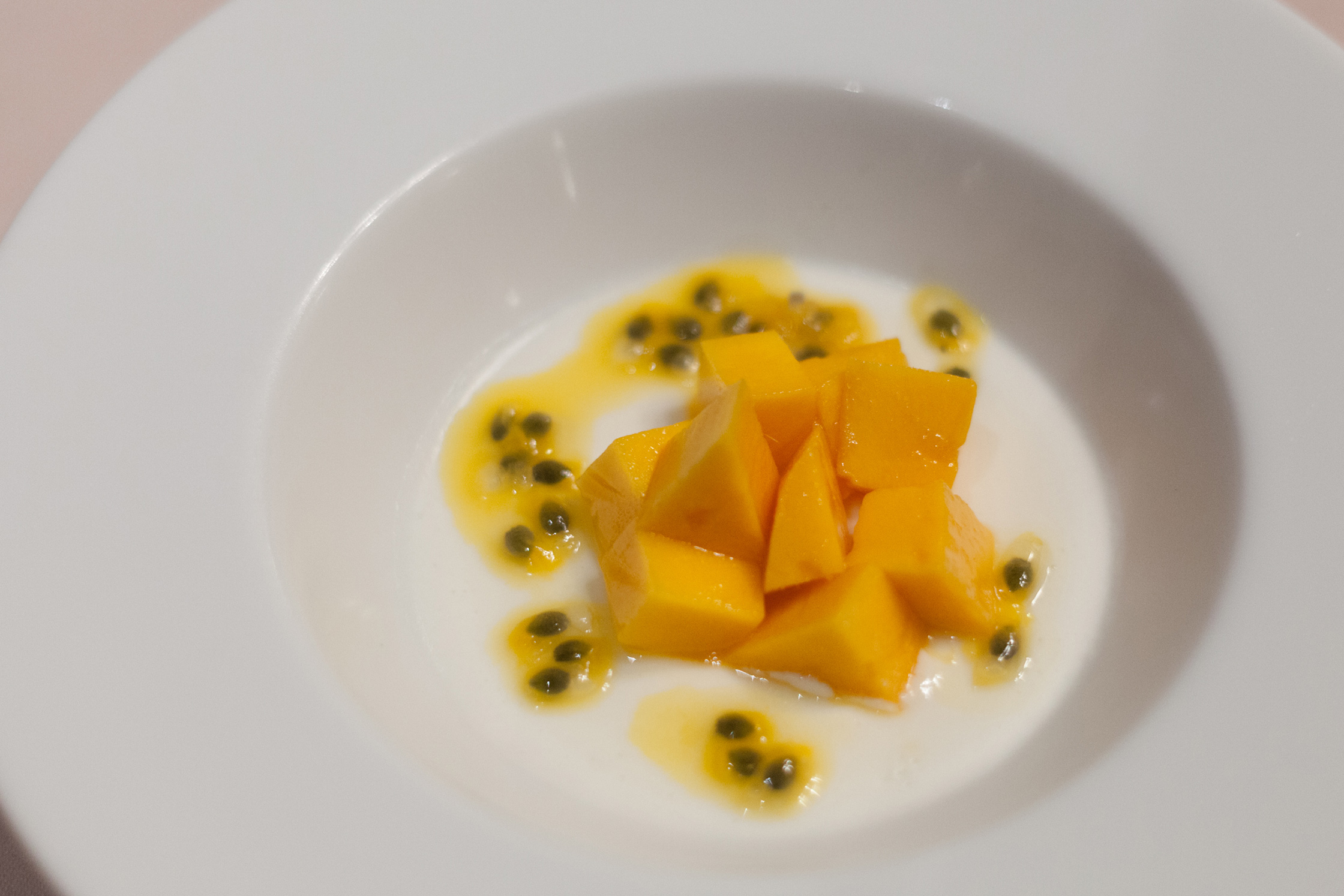 スプーンを進めると、マンゴーの下の甘いココナッツのブランマンジェ、そして周りにあるパッションフルーツの酸味がアクセントとなって、マンゴーの美味しさをより引き立てている。オレンジと白の色の対比も美しく、そして何より美味しいデザートだった。